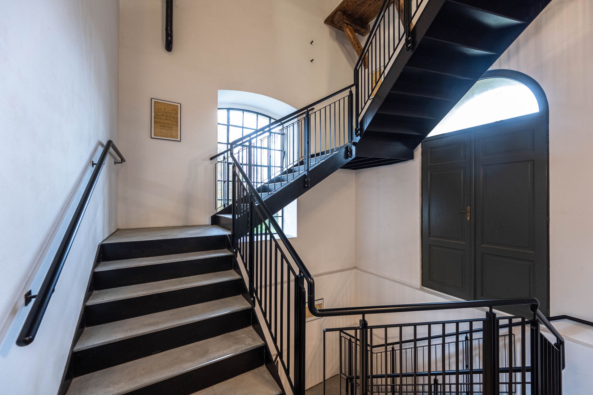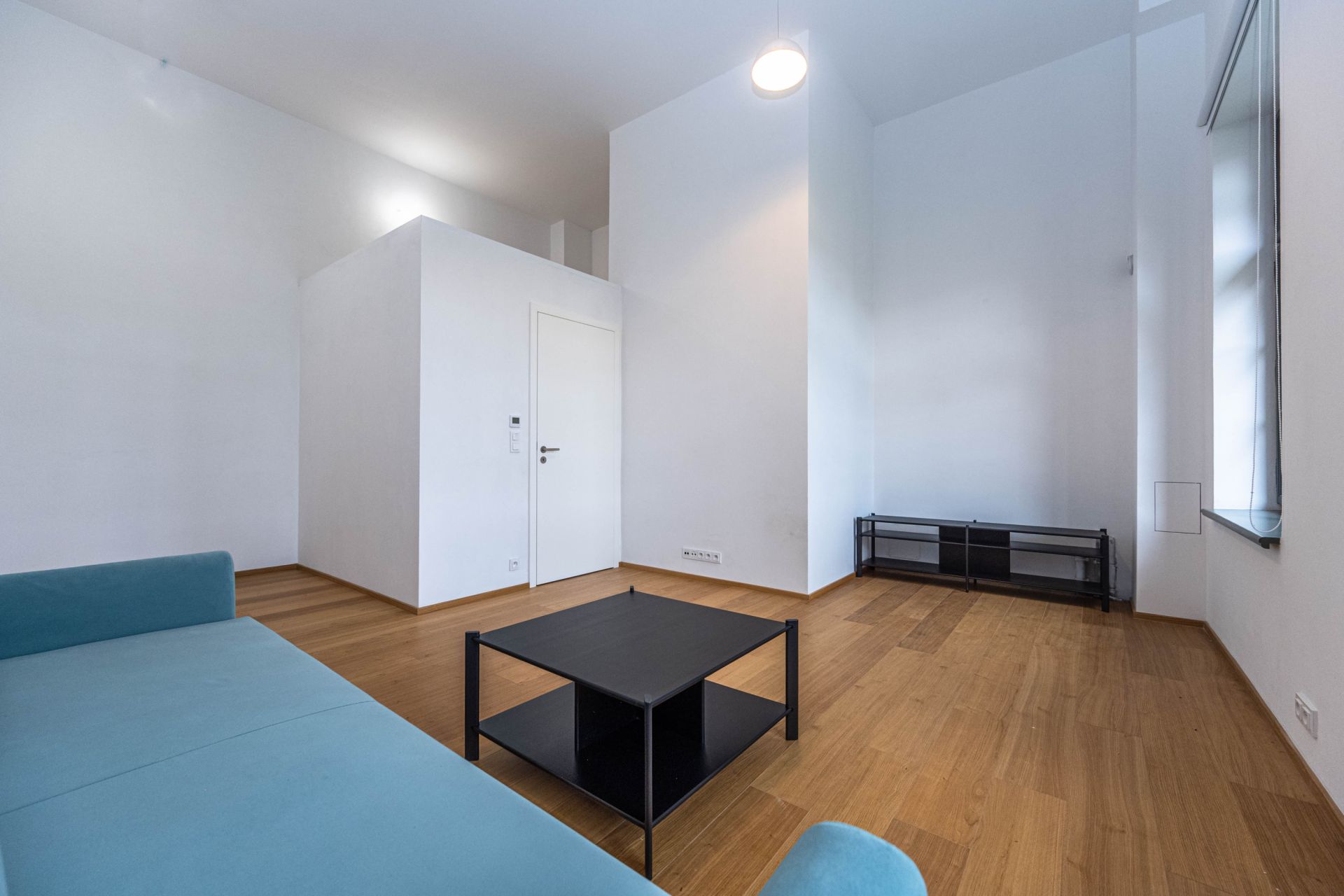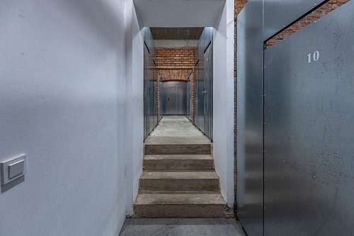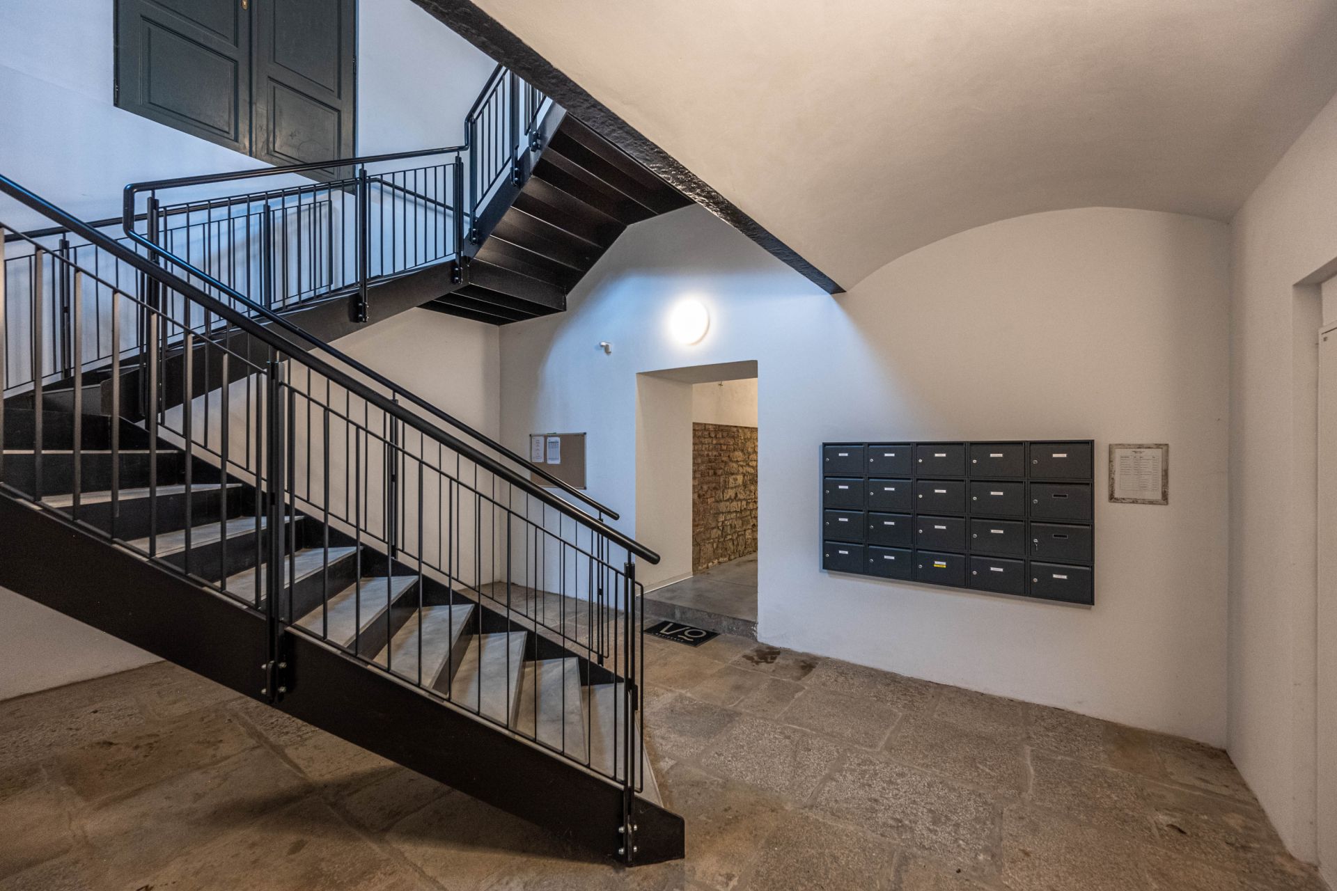 Interiér je navržen v moderním, světlém stylu s důrazem na jednoduchost a funkčnost. Vysoké stropy, velkoformátová okna a možnost využití vestavného nábytku včetně schodiště s úložnými prostory dávají bytu charakter městského loftu.