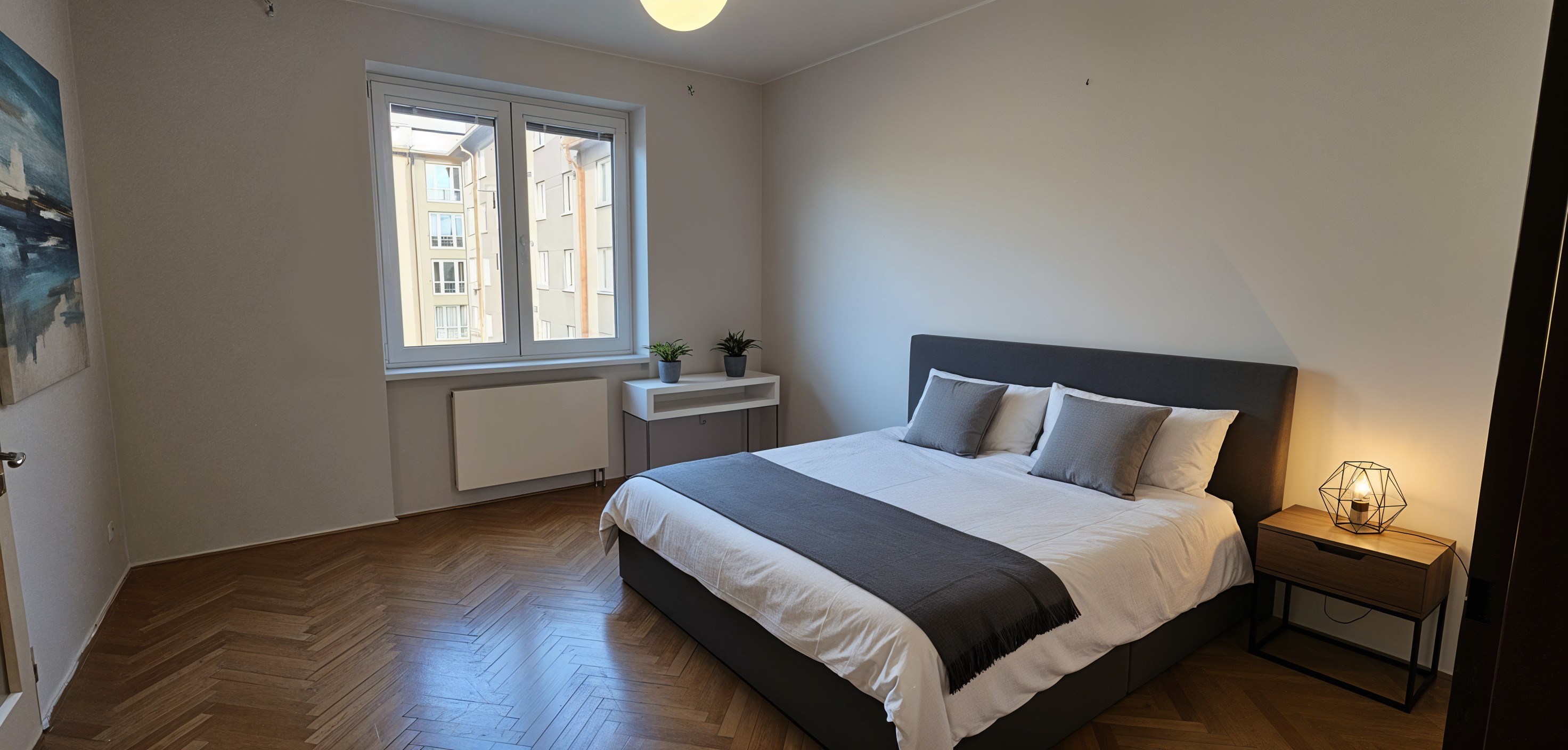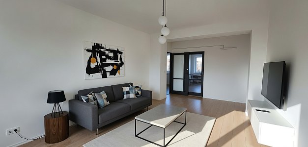 Jednotka nabízí prostor pro kuchyň o velikosti 10 m2 a ložnici o ploše 13 m2. Obě místnosti jsou orientovány na sever do klidného vnitrobloku, což zajišťuje maximální soukromí a ticho. Dominantou bytu je prostorný obývací pokoj o velikosti 22 m2, který nabízí dostatek místa pro odpočinek i společné chvíle s rodinou. Na oknech jsou elektrické venkovní rolety. Na podleze v pokojích jsou pěkné původní dřevěné parkety. Koupelna se sprchovým koutem je po rekonstrukci a toaleta je samostatná. K bytu patří sklepní kóje.